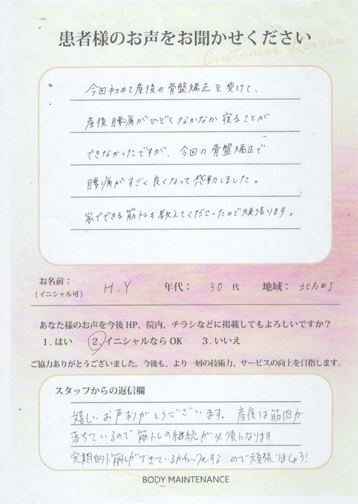 大野町 H.N様 30歳 (産後の骨盤矯正)