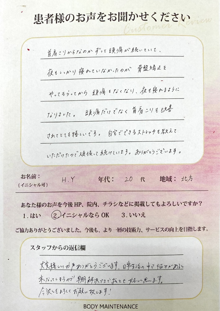 首肩こりからなのかずっと頭痛が続いていて、夜もしっかり眠れていないかったので骨盤矯正をやってもらってから頭痛もなくなり、夜も寝れるようになりました。頭痛だけでなく首肩こりも改善されてとても嬉しいです。自宅でできるストレッチも教えていただけたので頑張って続けています。ありがとうございます。