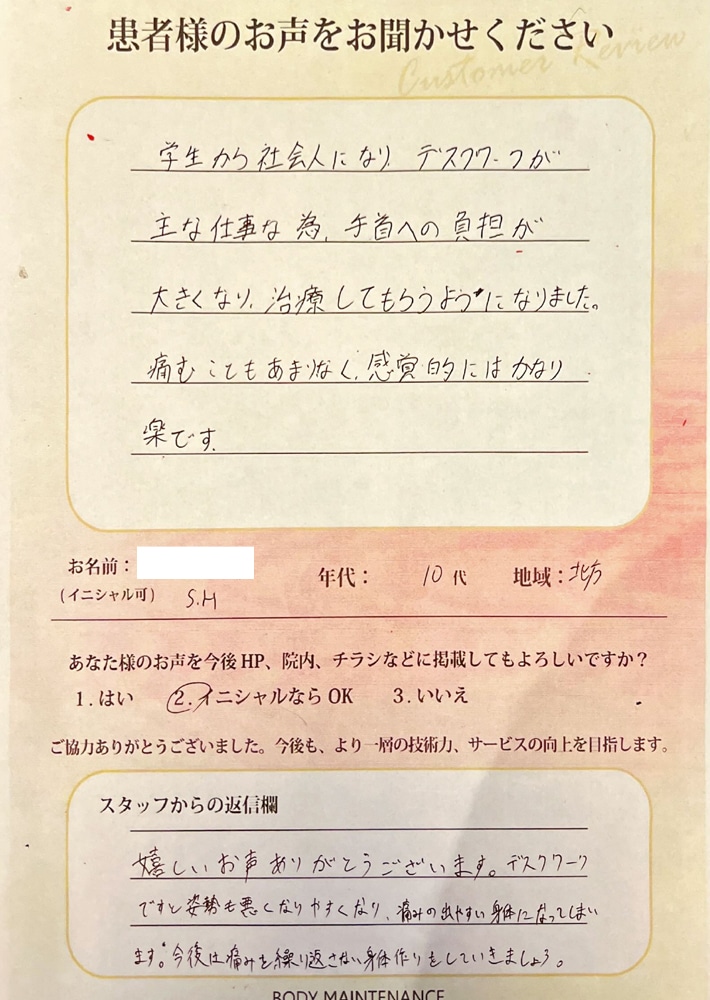 学生から社会人になり、デスクワークが主な仕事な為、手首への負担が大きくなり、治療してもらうようになりました。痛むこともあまりなく感覚的にはかなり楽です。