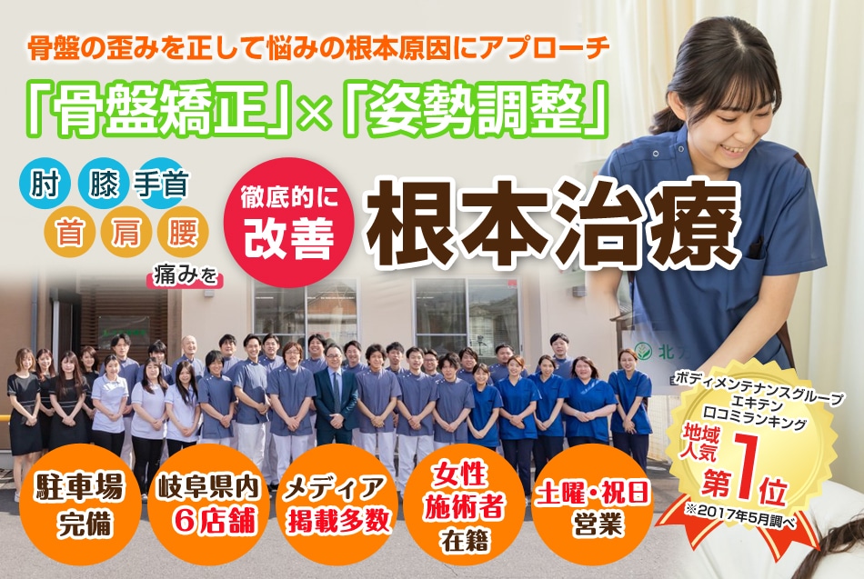岐阜のボディメンテナンス北方接骨院・整体院の施術は、即効性があるが痛みのない安全な「全身骨格矯正」で根本治療を行っています。当院の施術は、骨盤だけの矯正でなく全身の骨格と筋肉を整える施術を行うため、即効性があり・短時間で正しい姿勢を記憶させ痛みのない体作りをしています。