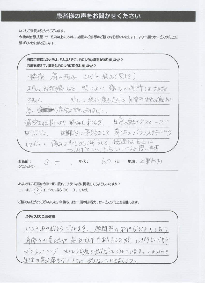 岐阜県 S.H 60代 (肩、腰痛、膝の痛み)