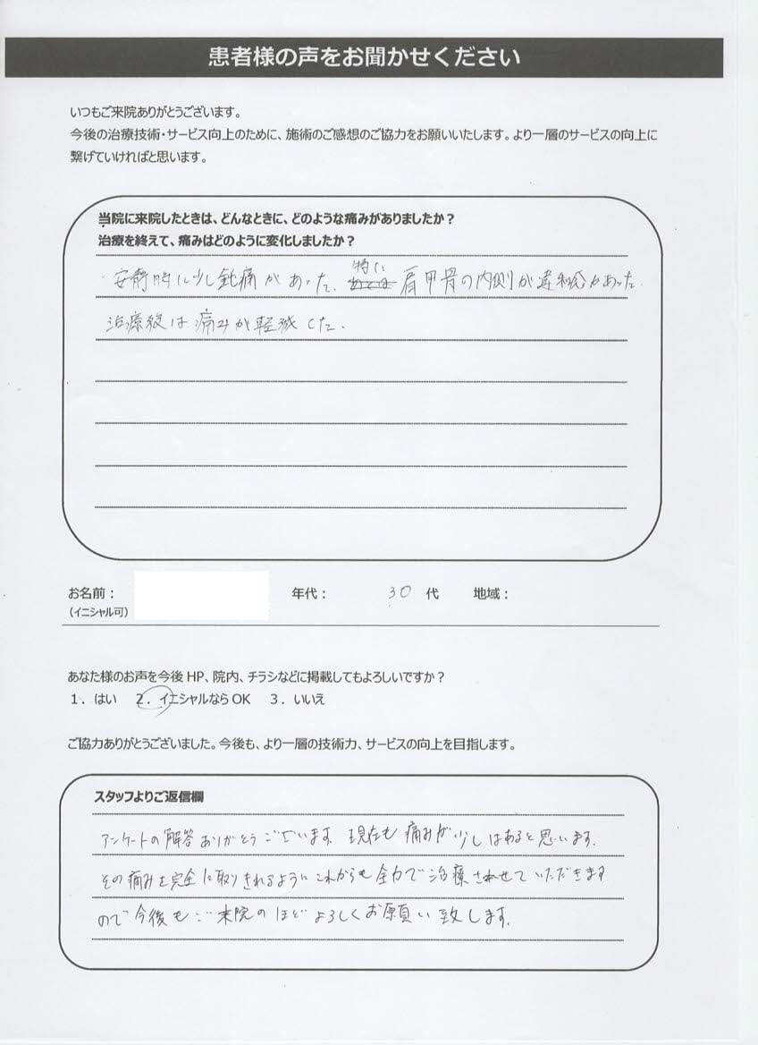 安静時に少鈍痛があった.特に肩甲骨の内側が違和感があった。治療後は痛みが軽減した。※