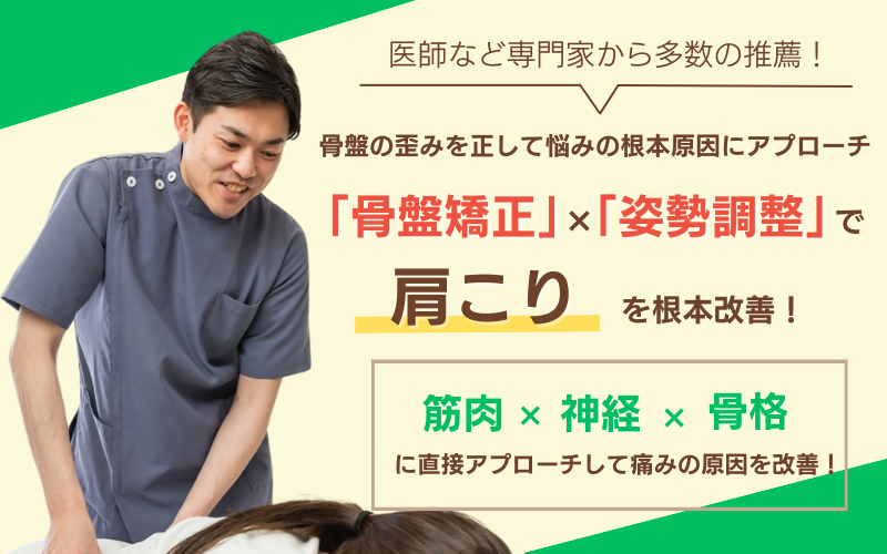 肩の筋肉だけではなく、背中にある肩甲骨周りの筋肉を緩めていくことで肩こりは改善しやすくなります。また、普段の姿勢自体を改善させないとまた肩こりが再発してしまうため、身体の土台である骨盤の歪みを矯正することで良い姿勢を保持することが出来、再発予防へと繋げていきます。