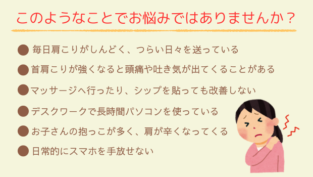 ・毎日肩こりがしんどく、つらい日々を送っている。