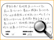 アンケートの解答ありがとうございます。交通事故の影響は長年続く ことがあります。現在は週に2回程しっかりと来院されていて症状はおちついていると思います。今の肩・首の症状も改善できるよう全力をつくしますので引き続きご来院おまちしております。
