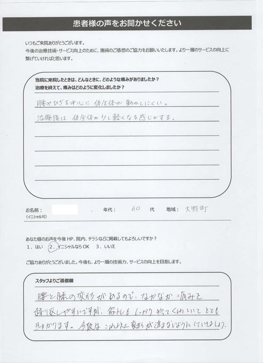 大野町 H.K 60代 (腰痛、膝の痛み)