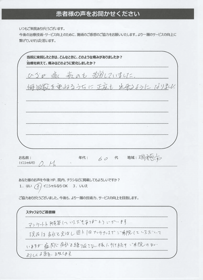 いつもありがとうございます。坐骨神経痛からくるヒザの痛みが少しずつですが改善されてきました。治療以外にも自宅でのセルフケアやトレーニングなども指導していただいて、ありがたいです。今後ともよろしくお願いします。