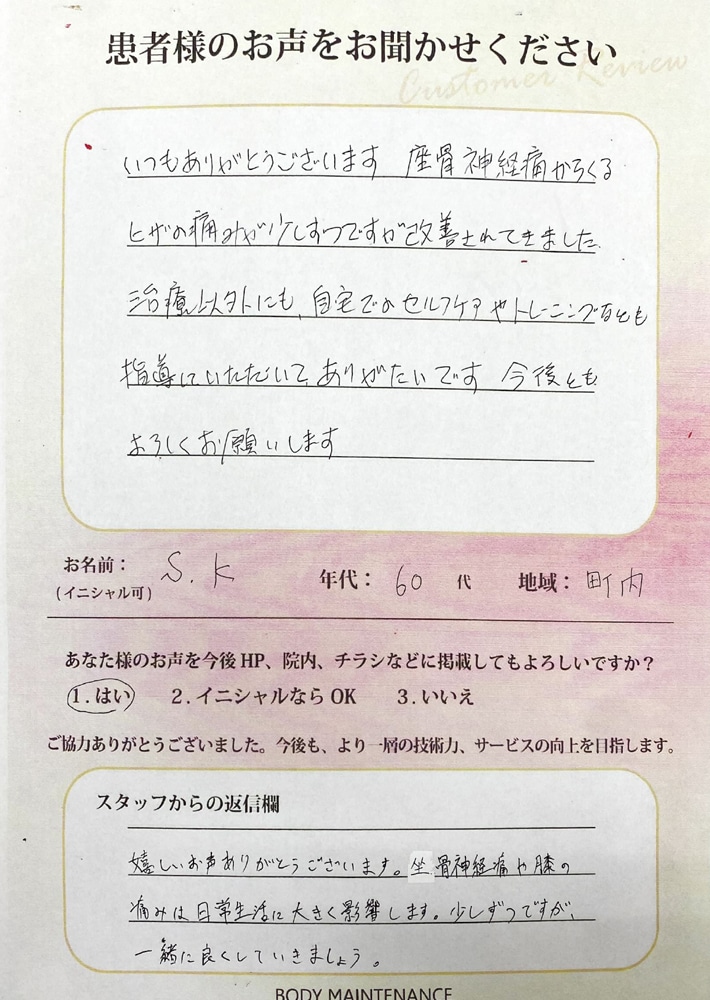 嬉しいお声ありがとうございます。坐骨神経痛や膝の痛みは日常生活に大きく影響します。少しずつですが、一緒に良くしていきましょう。